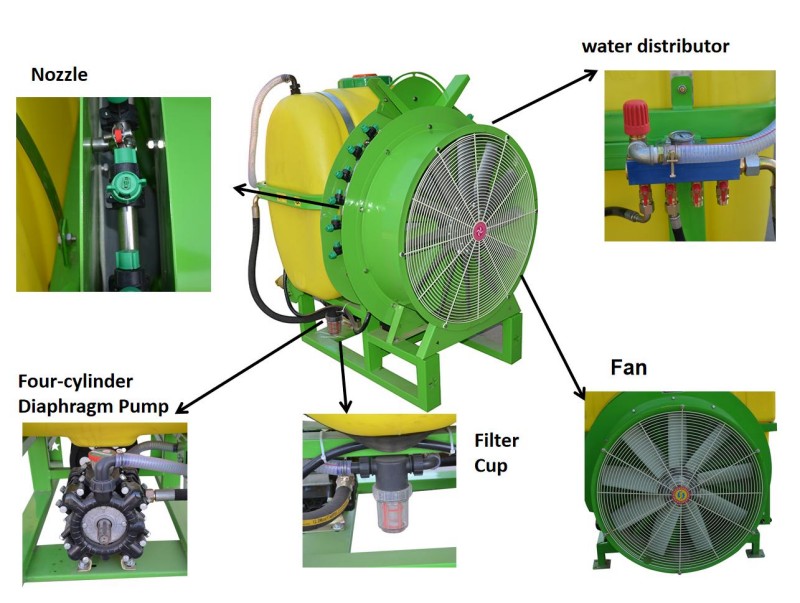 เมื่อรถแทรกเตอร์ขับปั๊มเหลวให้ทำงานน้ำในกล่องยาจะเข้าสู่ปั๊มเหลวผ่านหัวดูดน้ำสวิตช์และตัวกรอง จากนั้นจะเข้าสู่กล่องยาเหลวผ่านท่อส่งคืนและกวนท่อของสวิตช์หลักของตู้การกระจายความดัน ในขณะที่เติมน้ำลงในกล่องยายาฆ่าแมลงจะถูกเพิ่มเข้าไปในกล่องยาในสัดส่วนที่ต้องการเพื่อให้สารกำจัดศัตรูพืชผสมในขณะที่เติมน้ำ ในระหว่างการฉีดพ่นยาเหลวในกล่องยาเข้าสู่ปั๊มเหลวผ่านท่อทางออกตัวกรองและท่อน้ำเข้าของปั๊มเหลว ภายใต้การกระทำของปั๊มยาเหลวเข้าสู่สวิตช์หลักของวาล์วกระจายความดันจากท่อทางออกของปั๊ม เมื่อเปิดสวิตช์หลักส่วนหนึ่งของยาเหลวจะเข้าสู่หัวฉีดของอุปกรณ์พ่นผ่านท่อส่งยาผ่านสวิตช์สองตัวแยกกัน ยาเหลวที่มีแรงดันเข้าสู่หัวฉีดจะถูกพ่นออกมาในหมอกภายใต้การกระทำของหัวฉีดและหยดจะถูกทำให้เป็นอะตอมอีกครั้งผ่านการไหลเวียนของอากาศที่แข็งแกร่งที่เกิดจากพัดลม ในเวลาเดียวกันหยดน้ำที่ดีอะตอมจะถูกพัดเข้าไปในหลังคาของต้นไม้ผล